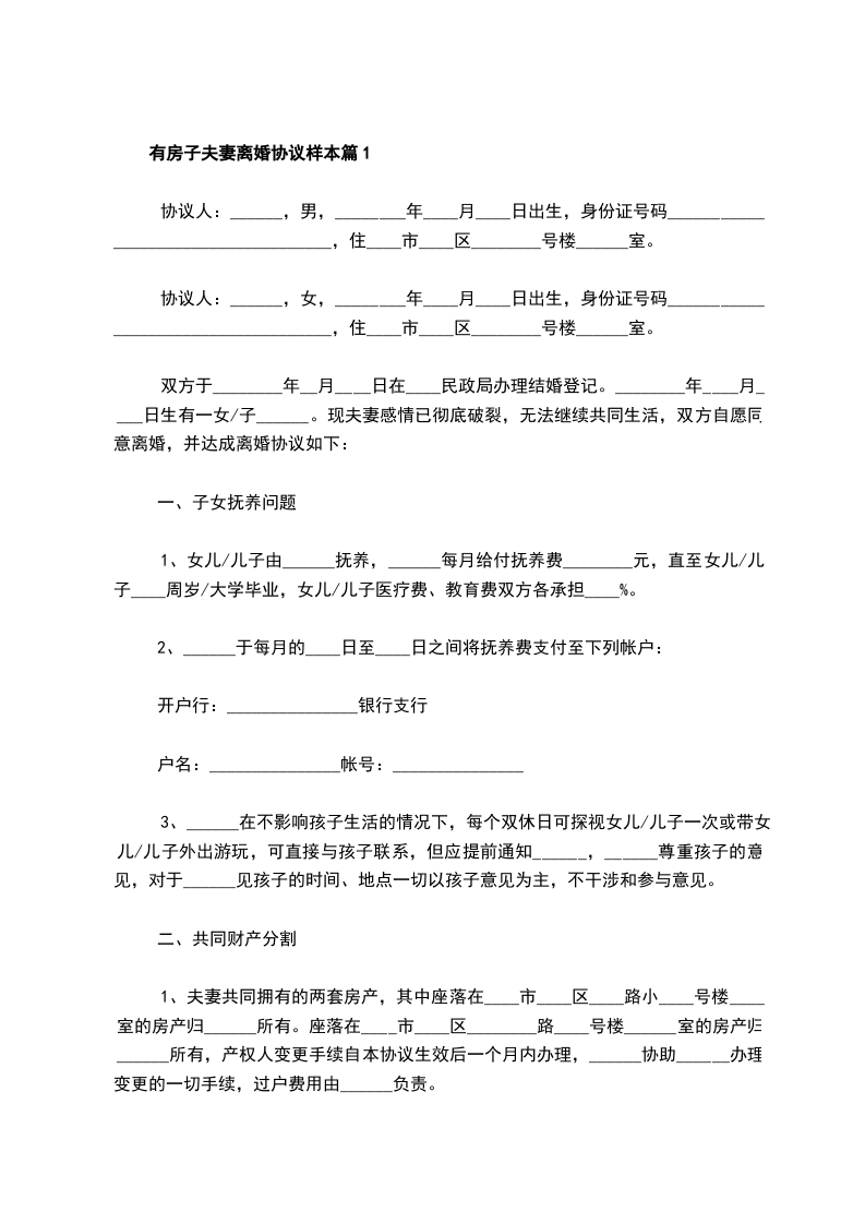 1、夫妻共同拥有的两套房产,其中座落在____市____区____路小____号楼____室的房产归______所有。座落在____市____区________路____号楼______室的房产归______所有,产权人变更手续自本协议生效后一个月内办理,______协助______办理变更的一切手续,过户费用由______负责。