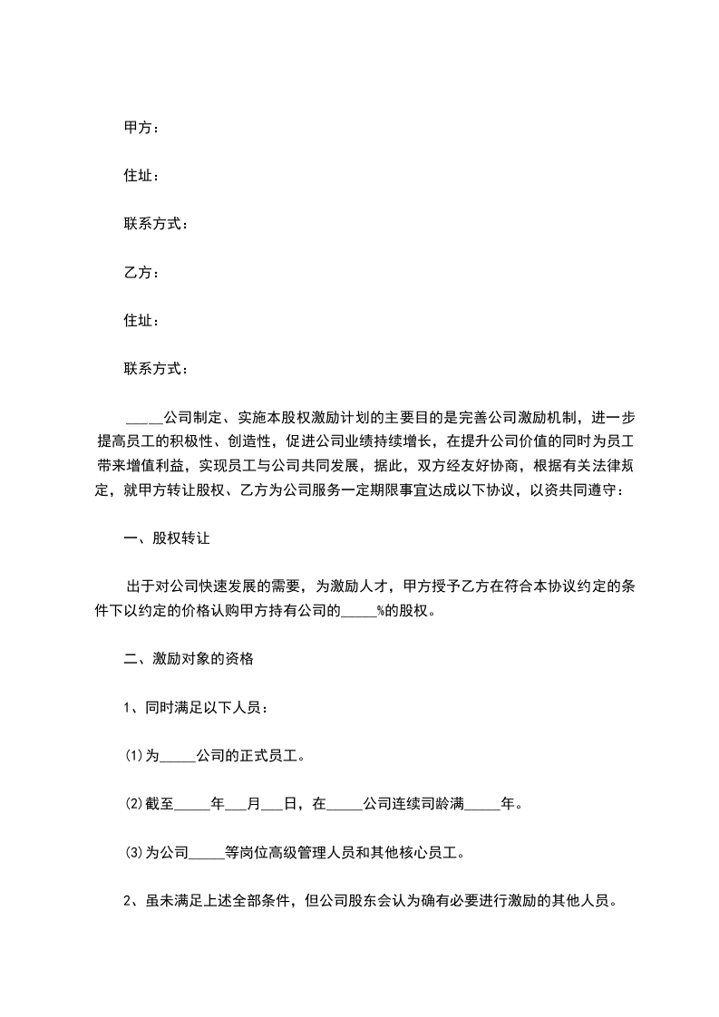 出于对公司快速发展的需要,为激励人才,甲方授予乙方在符合本协议约定的条件下以约定的价格认购甲方持有公司的_____%的股权。