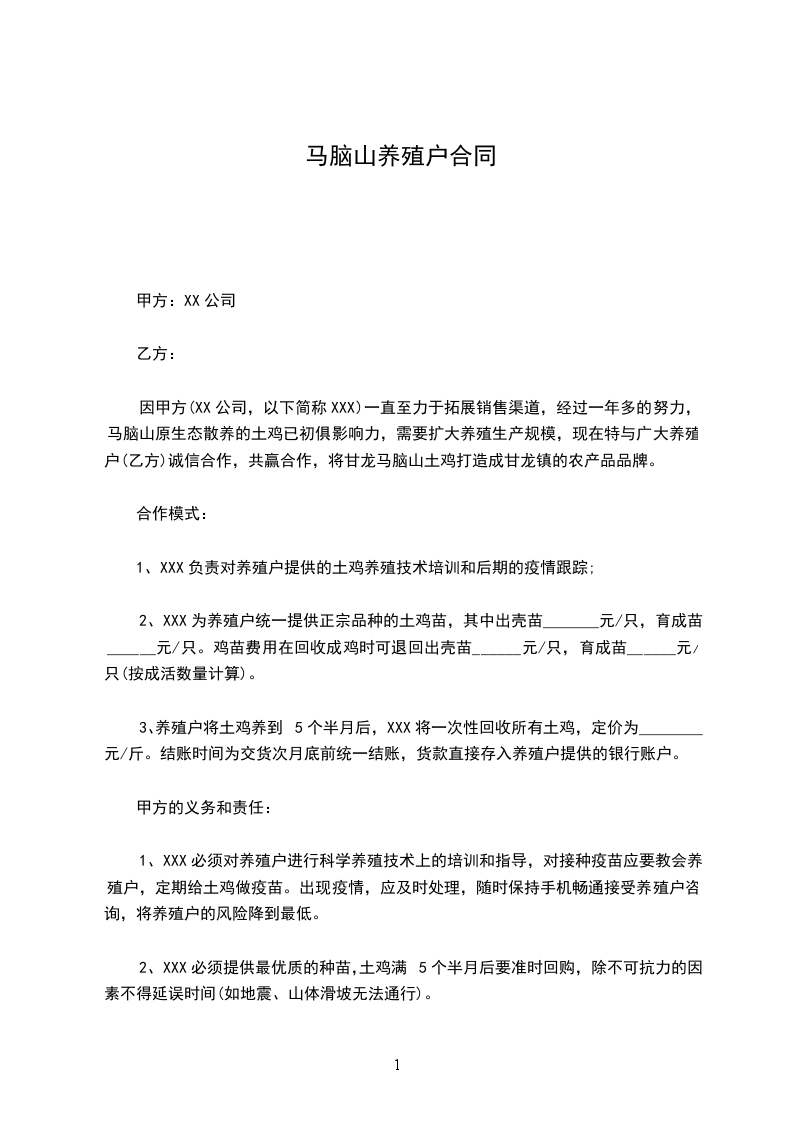 因甲方(XX公司,以下简称XXX)一直至力于拓展销售渠道,经过一年多的努力,马脑山原生态散养的土鸡已初俱影响力,需要扩大养殖生产规模,现在特与广大养殖户(乙方)诚信合作,共赢合作,将甘龙马脑山土鸡打造成甘龙镇的农产品品牌。