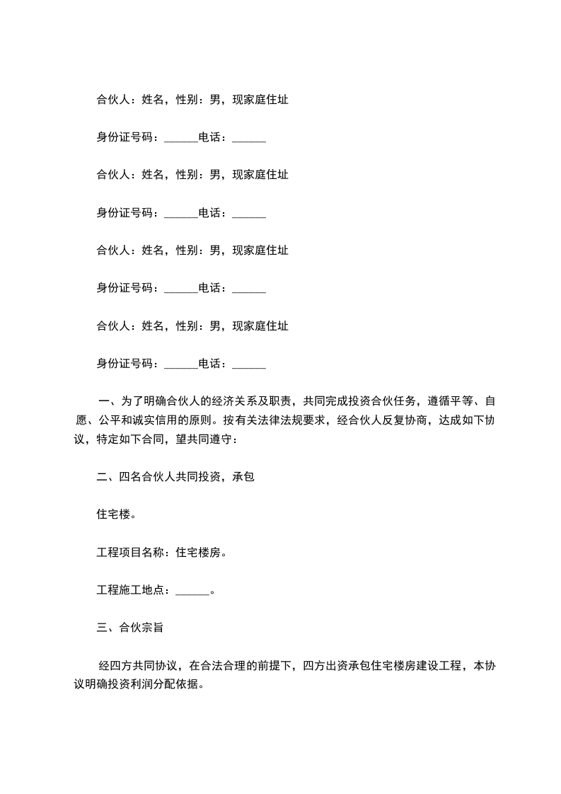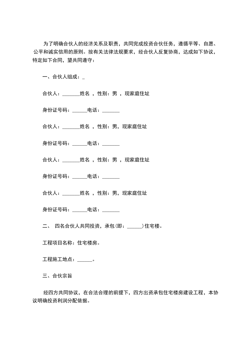 经四方共同协议,在合法合理的前提下,四方出资承包住宅楼房建设工程,本协议明确投资利润分配依据。
