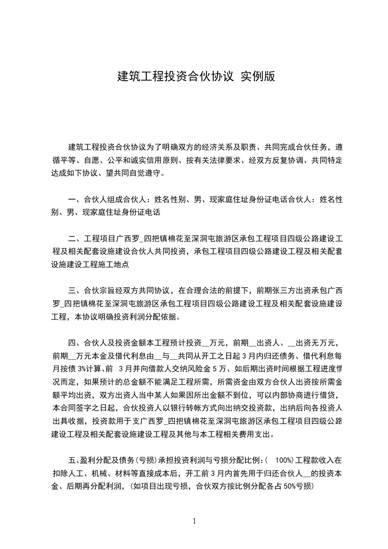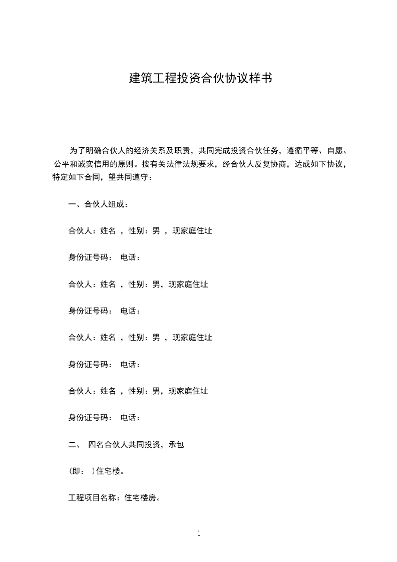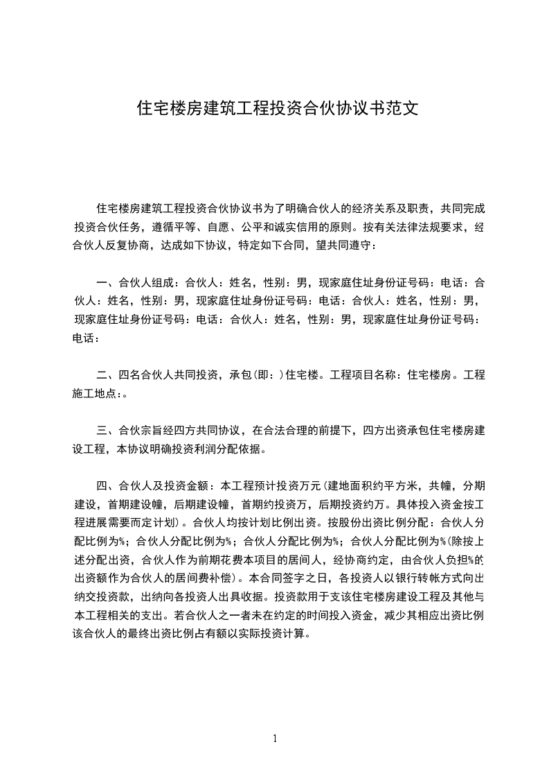 本工程预计投资 万元(建地面积约 平方米,共 幢,分 期建设,首期建设 幢,后期建设 幢,首期约投资 万,后期投资约 万。具体投入资金按工程进展需要而定计划)。合伙人均按计划比例出资。按股份出资比例分配:合伙人 分配比例为 %;合伙人 分配比例为 %;合伙人 分配比例为 %;合伙人 分配比例为 %(除按上述分配出资,合伙人 作为前期花费本项目的居间人,经协商约定,由合伙人 负担 %的出资额作为合伙人