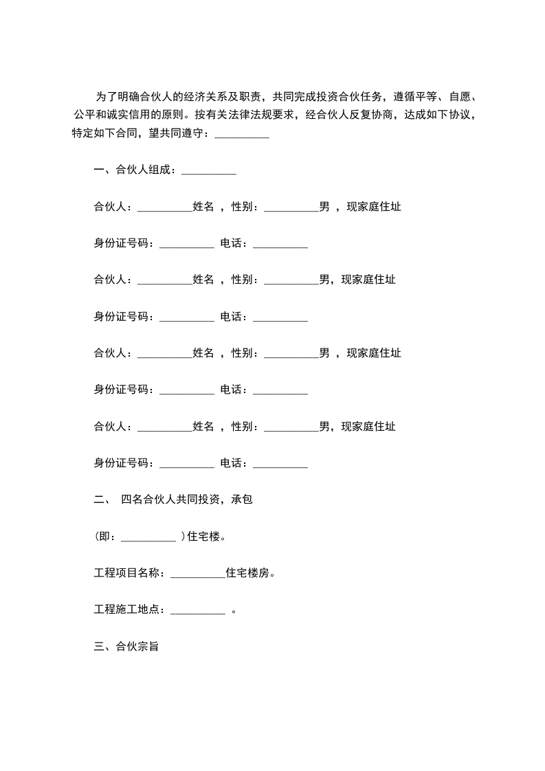 为了明确合伙人的经济关系及职责,共同完成投资合伙任务,遵循平等、自愿、公平和诚实信用的原则。按有关法律法规要求,经合伙人反复协商,达成如下协议,特定如下合同,望共同遵守: