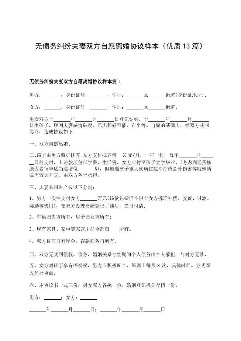 八、本协议一式三份,男、女双方各执一份,婚姻登记机关存档一份。