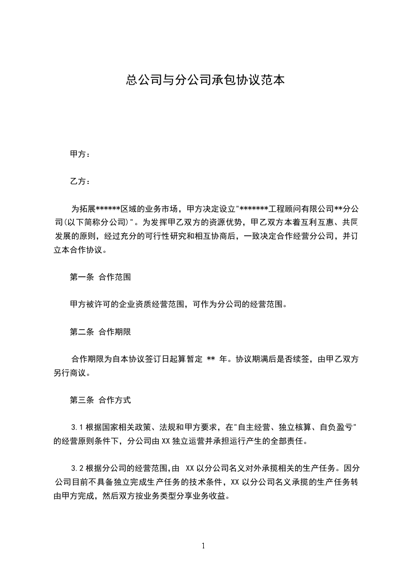 3.1根据国家相关政策、法规和甲方要求,在"自主经营、独立核算、自负盈亏"的经营原则条件下,分公司由XX独立运营并承担运行产生的全部责任。