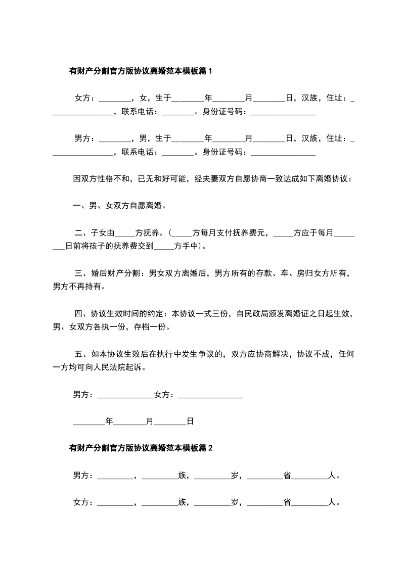 有财产分割官方版协议离婚范本模板篇2