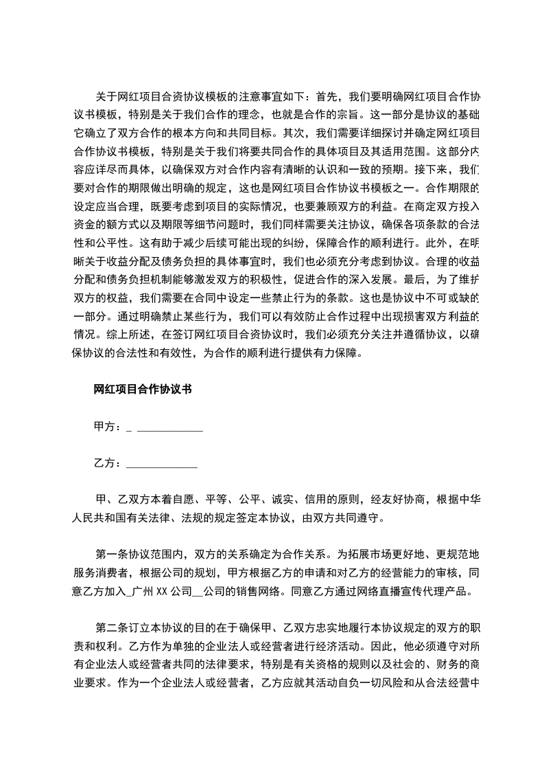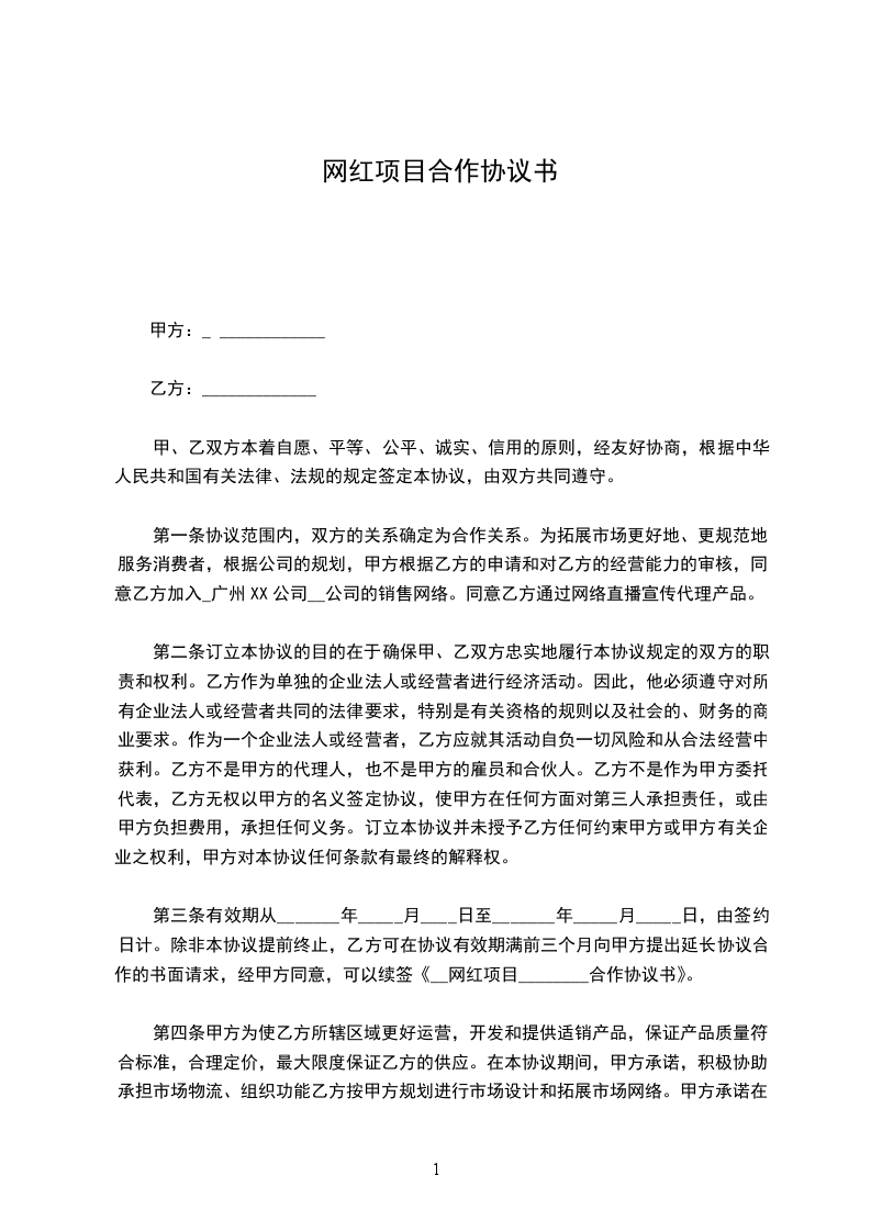 第三条有效期从_______年_____月____日至_______年_____月_____日,由签约日计。除非本协议提前终止,乙方可在协议有效期满前三个月向甲方提出延长协议合作的书面请求,经甲方同意,可以续签《__网红项目________合作协议书》。