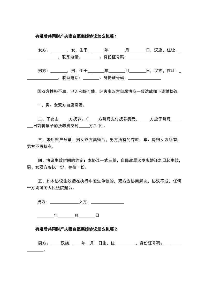 男女双方于_______年_______月_______日在_______民政局(办)办理结婚登记手续。_______年_______月_______日生育一子(女)_______(身份证号:______________)。因协议人双方性格不合,夫妻感情破裂,无法继续共同生活,已无和好可能。现双方就自愿离婚一事达成如下协议: