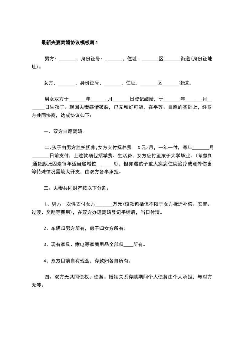 最新夫妻离婚协议模板篇1