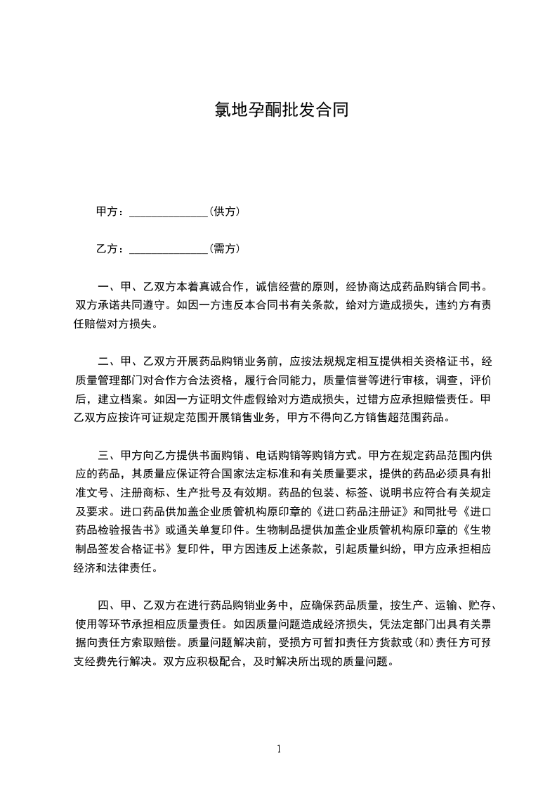 一、甲、乙双方本着真诚合作,诚信经营的原则,经协商达成药品购销合同书。双方承诺共同遵守。如因一方违反本合同书有关条款,给对方造成损失,违约方有责任赔偿对方损失。