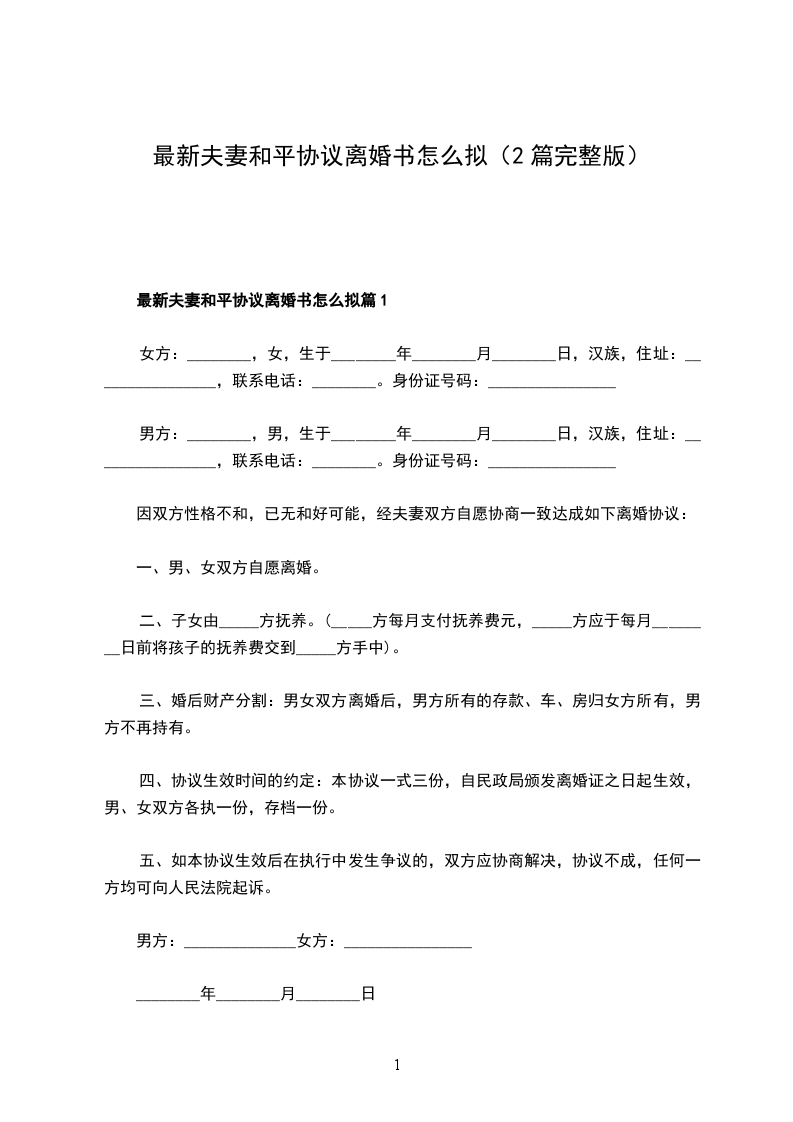 最新夫妻和平协议离婚书怎么拟篇2