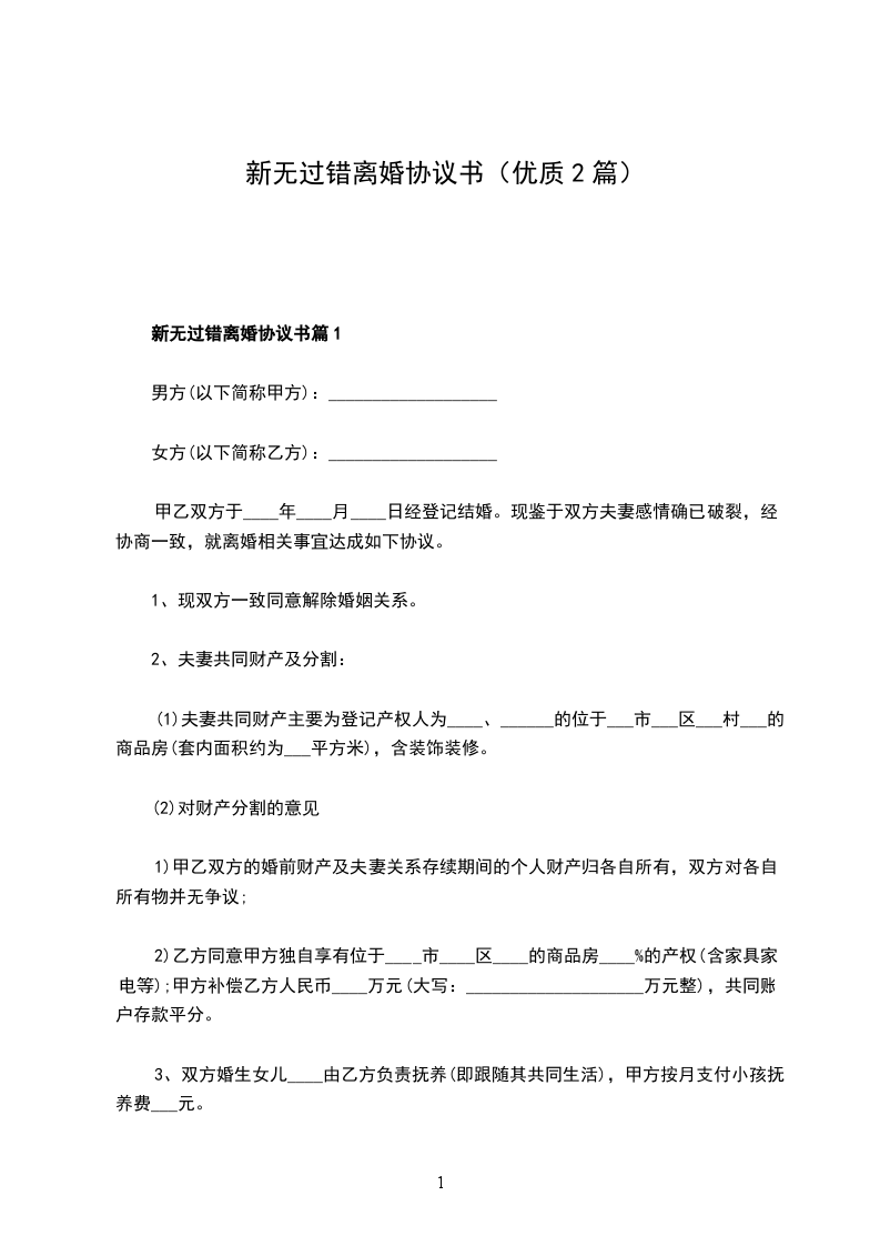 新无过错离婚协议书篇1
