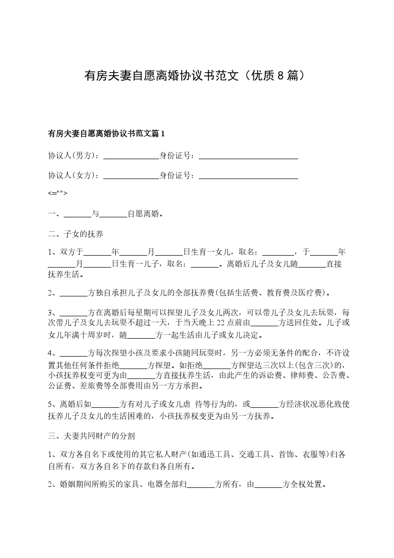(1)夫妻购有坐落在________市_____________路____________________住房一套,合同价人民币________万元(大写:___________________________),现值人民币________万元(大写:__________________________)。购房时以____方主贷人贷款________万元(大写:________________________),现剩余贷款本金________万元(大写:______________________)。该房购买时首付________万元(大写:______________________)。现协商该套房产归____方所有,由____方一次性给付____方现金________万元(大写:______________________),此款在本协议签订后日付清。