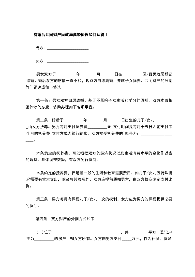 第一条:男女双方自愿离婚。基于不影响子女生活和学习的原则,双方本着相互体谅的态度,协助办理如下各项事宜。