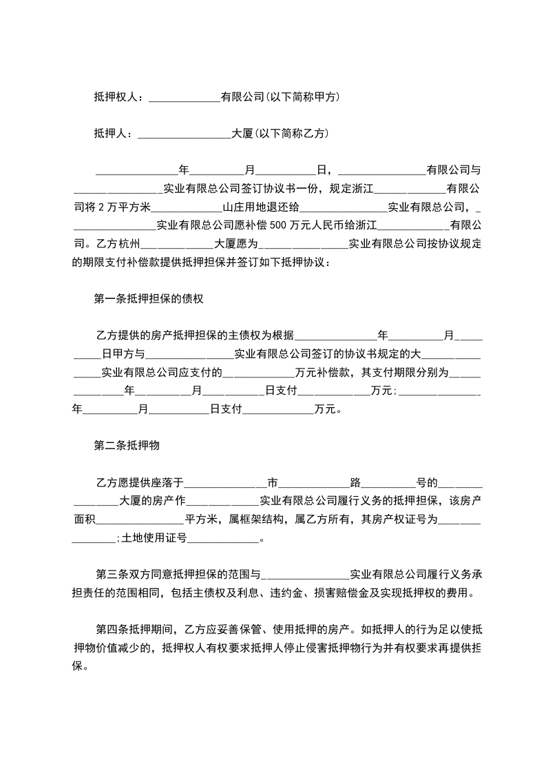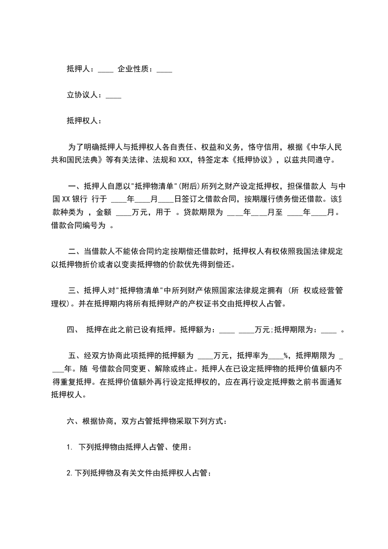 九、抵押权人占管、保管抵押物及有关文件、凭证,按照有关规定由抵押人向抵押权人交纳保管费 ____元,本协议生效后三十日内结清。