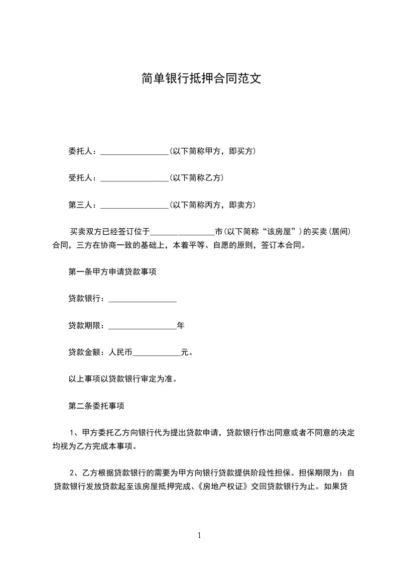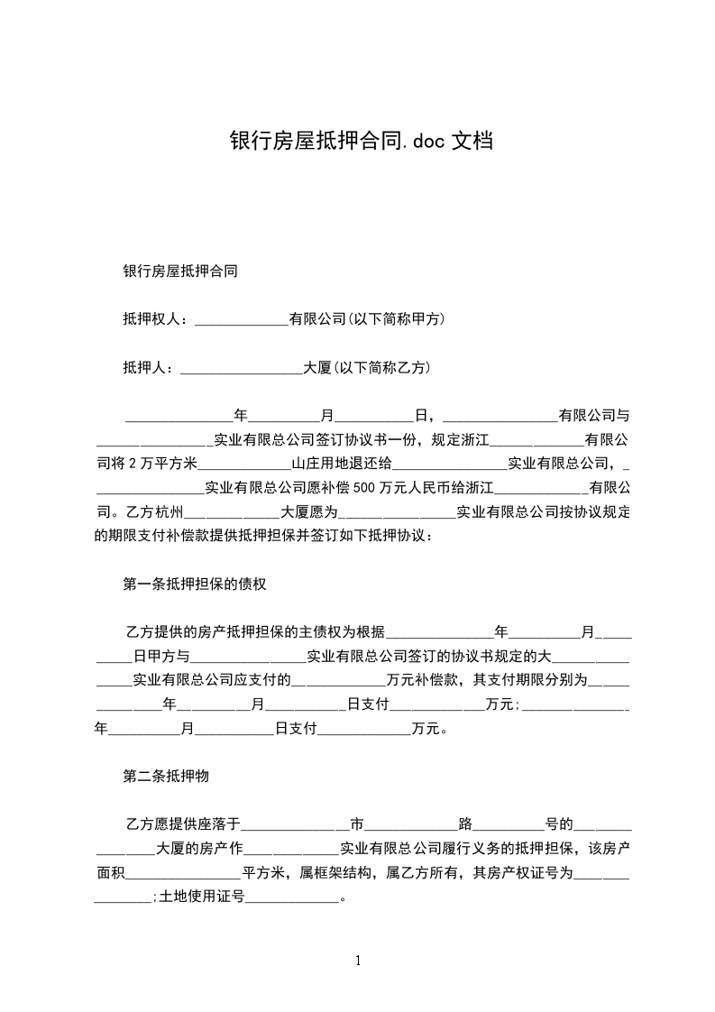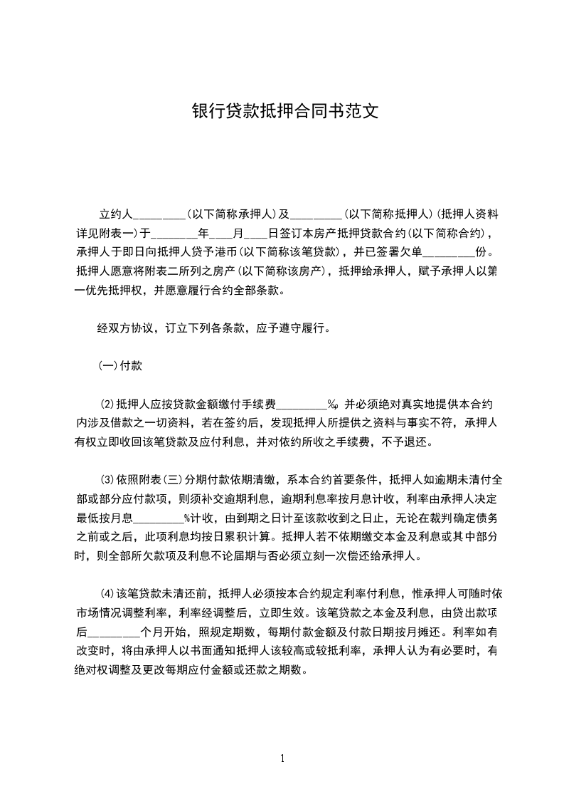 一、抵押人自愿以"抵押物清单"(附后)所列之财产设定抵押权,担保借款人 与中国XX银行 行于 ____年____月____日签订之借款合同,按期履行债务偿还借款。该贷款种类为 ,金额 ____万元,用于 。贷款期限为 ____年____月至 ____年____月。借款合同编号为 。