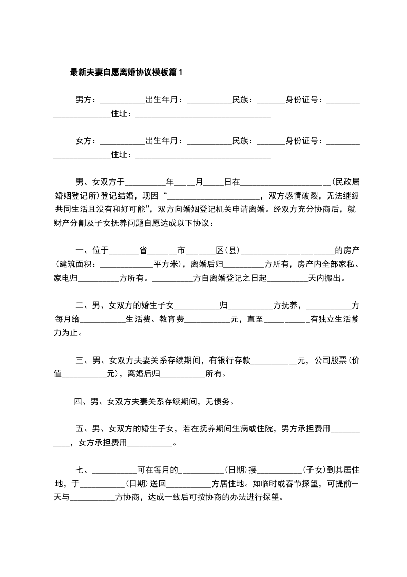 男方与女方于____年__月__日登记结婚。现因__自愿解除婚姻关系,经双方协商订立离婚协议如下: