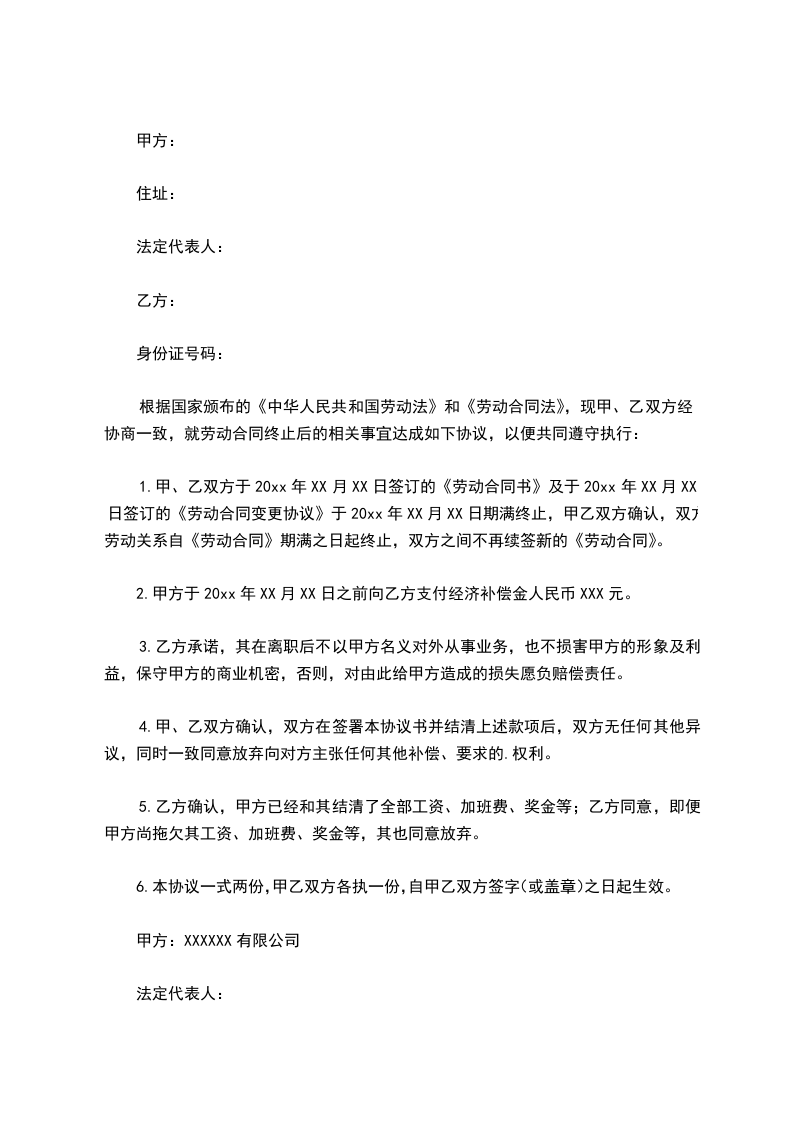 2.甲方于20xx年XX月XX日之前向乙方支付经济补偿金人民币XXX元。