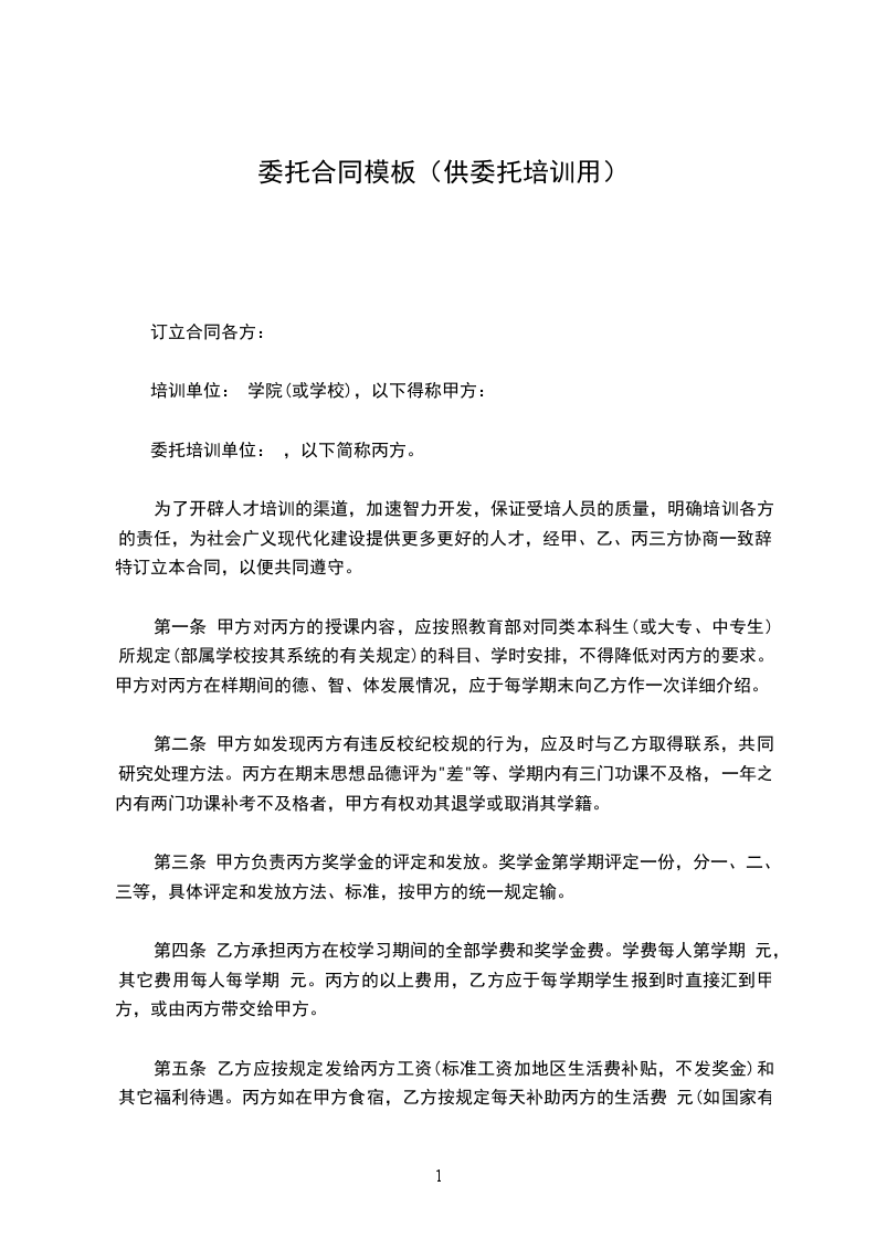 为了开辟人才培训的渠道,加速智力开发,保证受培人员的质量,明确培训各方的责任,为社会广义现代化建设提供更多更好的人才,经甲、乙、丙三方协商一致辞,特订立本合同,以便共同遵守。