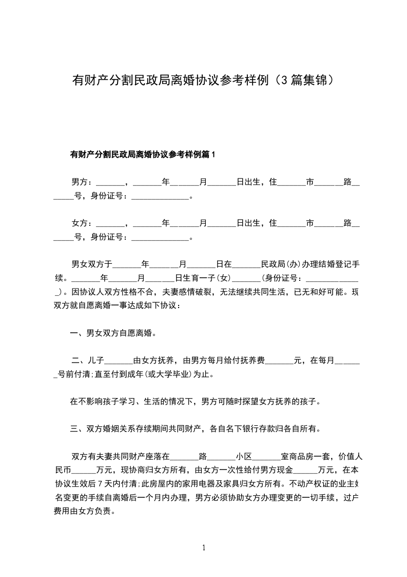 ⑴存款:双方名下现有银行存款共_元,双方各分一半,为_____元。分配方式:各自名下的存款保持不变,但男方/女方应于_____年___月___日前一次性支付_____元给女方/男方。