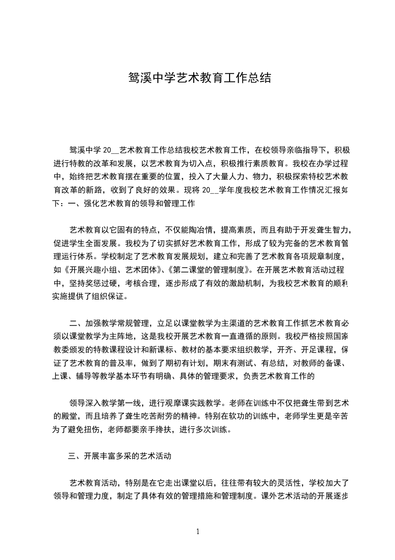 鸳溪中学20__艺术教育工作总结我校艺术教育工作,在校领导亲临指导下,积极进行特教的改革和发展,以艺术教育为切入点,积极推行素质教育。我校在办学过程中,始终把艺术教育摆在重要的位置,投入了大量人力、物力,积极探索特校艺术教育改革的新路,收到了良好的效果。现将20__学年度我校艺术教育工作情况汇报如下:一、强化艺术教育的领导和管理工作