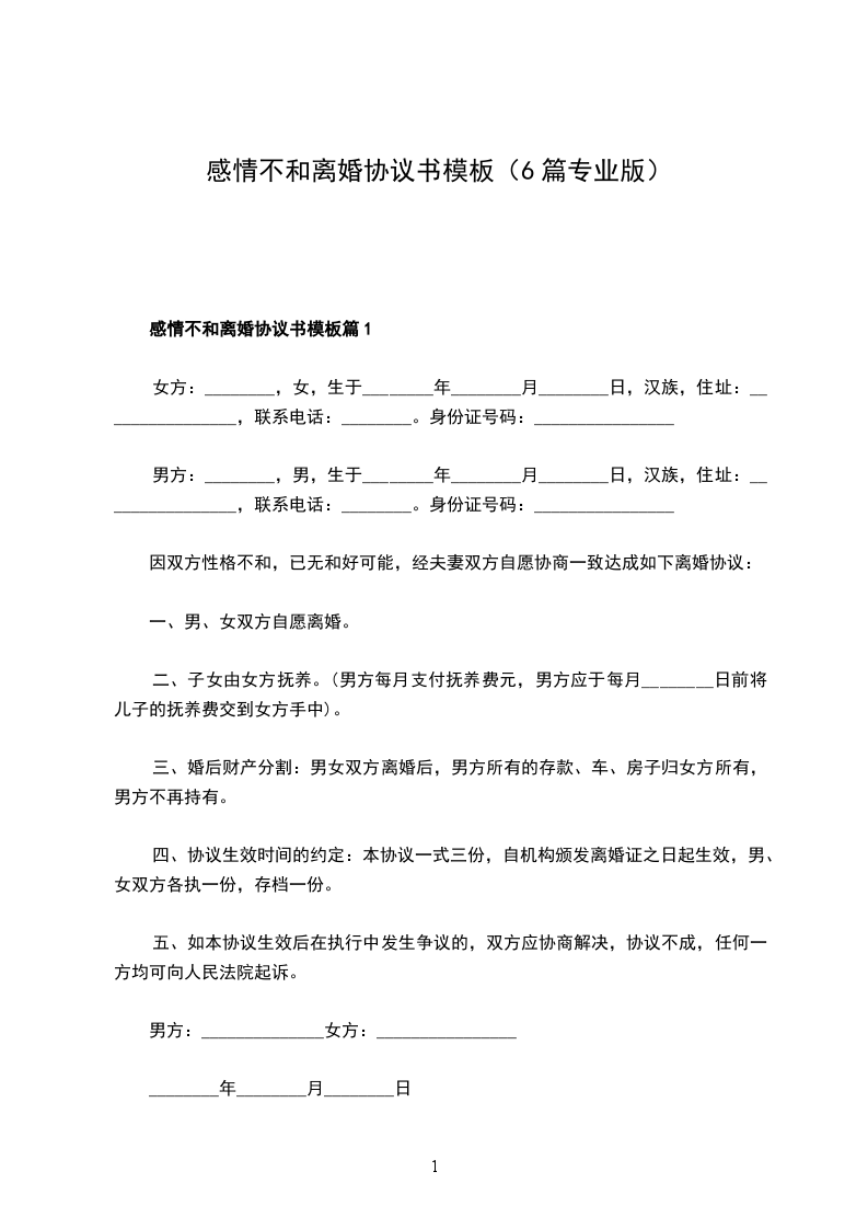 关于感情不和离婚协议篇1