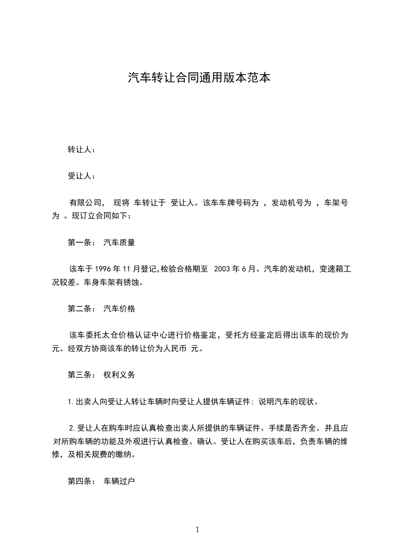 有限公司, 现将 车转让于 受让人。该车车牌号码为 ,发动机号为 ,车架号为 。现订立合同如下: