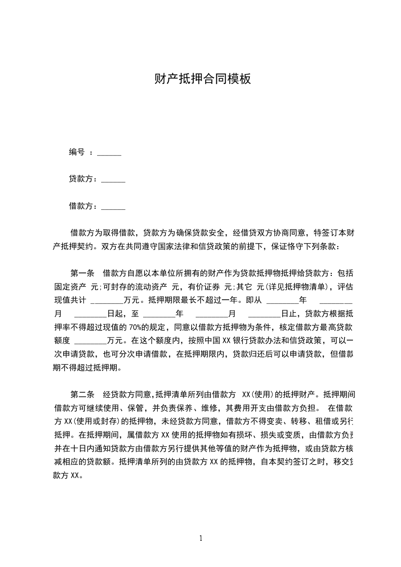 第一条 借款方自愿以本单位所拥有的财产作为贷款抵押物抵押给贷款方:包括固定资产 元;可封存的流动资产 元,有价证券 元;其它 元(详见抵押物清单),评估现值共计 ________万元。抵押期限最长不超过一年。即从 ________年 ________月 ________日起,至 ________年 ________月 ________日止,贷款方根据抵押率不得超过现值的70%的规定,同意以借款方抵押物为条件,核定借款方最高贷款额度 ________万元。在这个额度内,按照中国XX银行贷款办法和信贷政策,可以一次申请贷款,也可分次申请借款,在抵押期限内,贷款归还后可以申请贷款,但借款期不得超过抵押期。