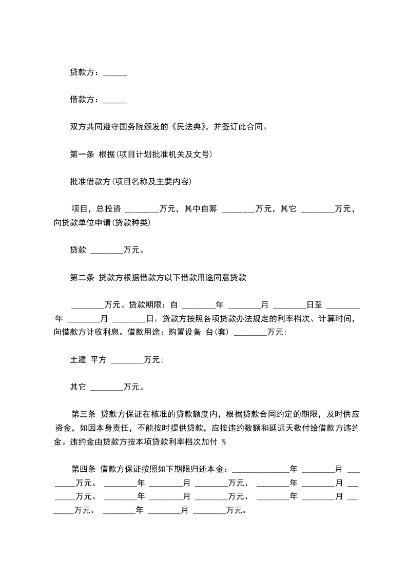 ________万元。贷款期限:自 ________年 ________月 ________日至 ________年 ________月 ________日。贷款方按照各项贷款办法规定的利率档次、计算时间,向借款方计收利息。借款用途:购置设备 台(套) ________万元;