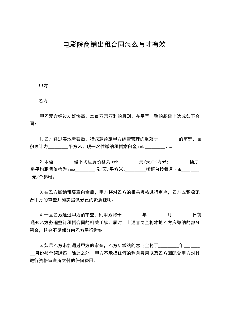 1.乙方经过实地考察后,特诚意预定甲方经营管理的坐落于_________的商铺,面积预计为_________平方米,现一次性缴纳租赁意向金rmb_________元。