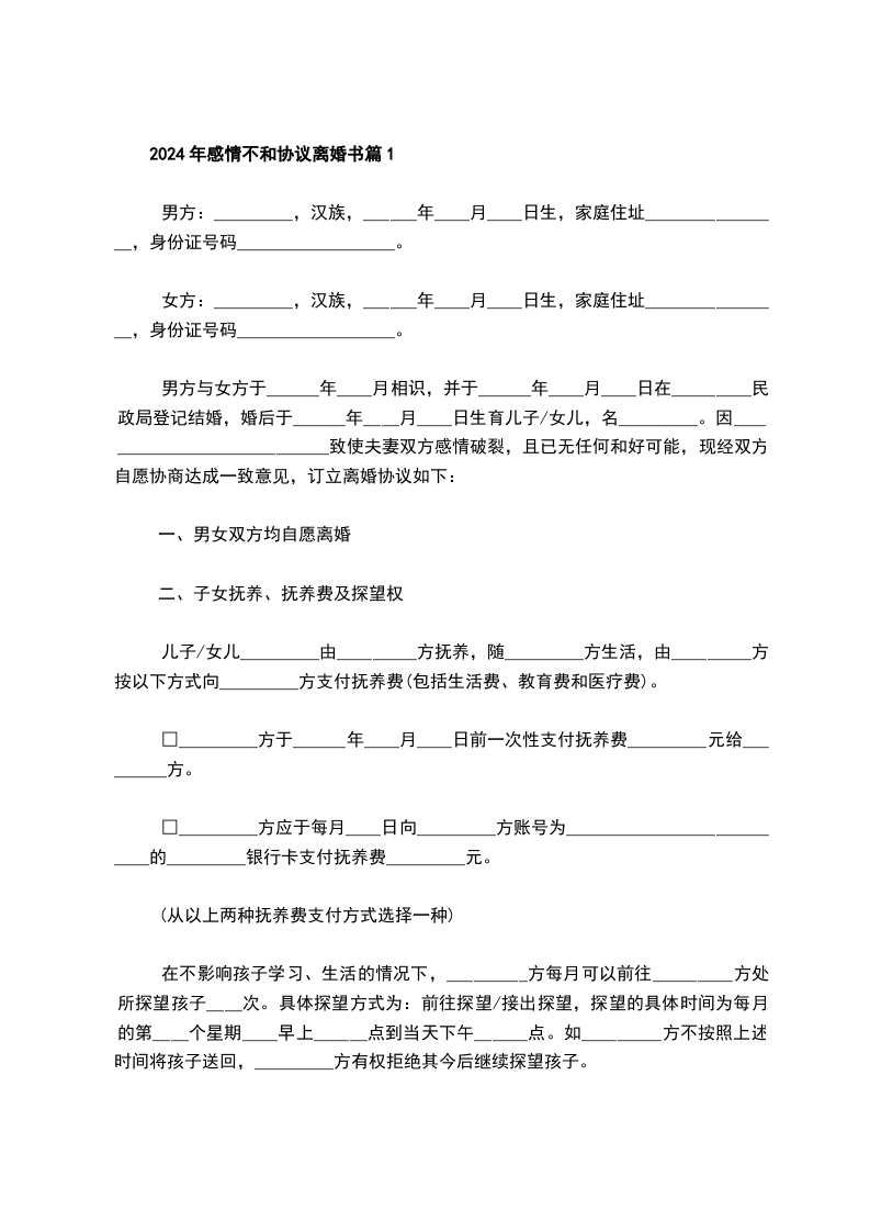 2024年感情不和协议离婚书篇1
