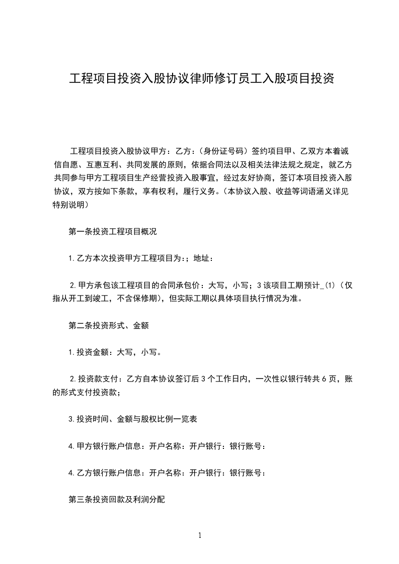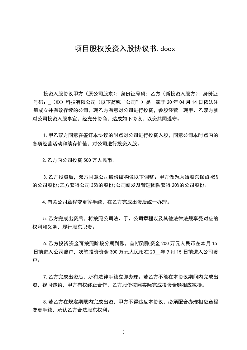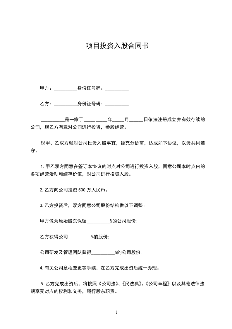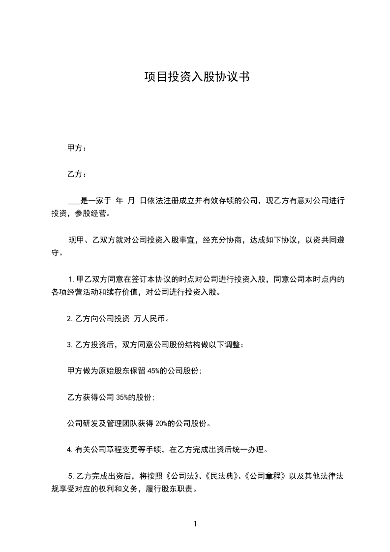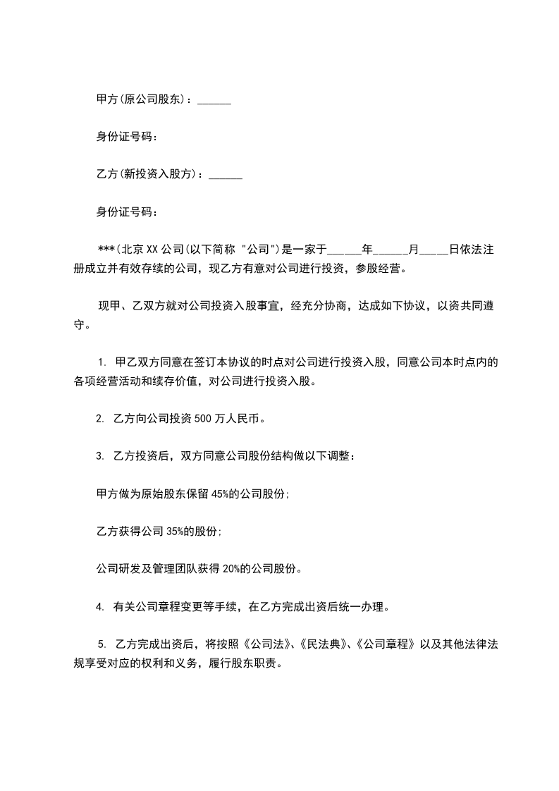 1. 甲乙双方同意在签订本协议的时点对公司进行投资入股,同意公司本时点内的各项经营活动和续存价值,对公司进行投资入股。