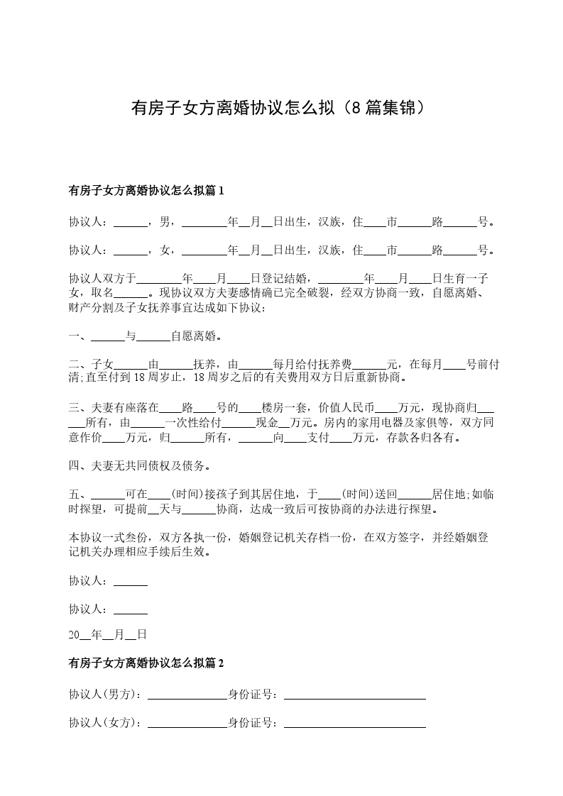 2、【房产】双方有夫妻共同财产座落在××路××小区××室商品房一套,价值人民币×××××万元,现协商归男方/女方所有,由男方/女方一次性给付男方/女方现金×××××万元,此款在本协议签订后的××天内付清;此房内的家用电器及家俱归男方/女方所有。