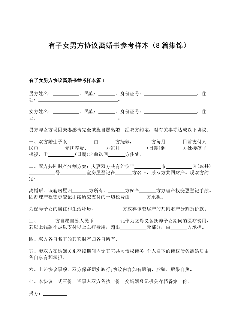 本协议一式三份。男、女双方各执一份,婚姻登记机关存档一份,自婚姻登记机颁发《离婚证》之日起生效。
