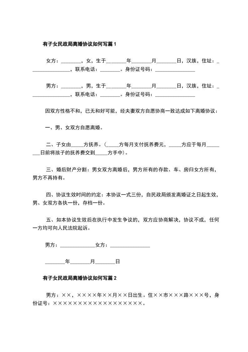 有子女民政局常用离婚协议如何写篇7