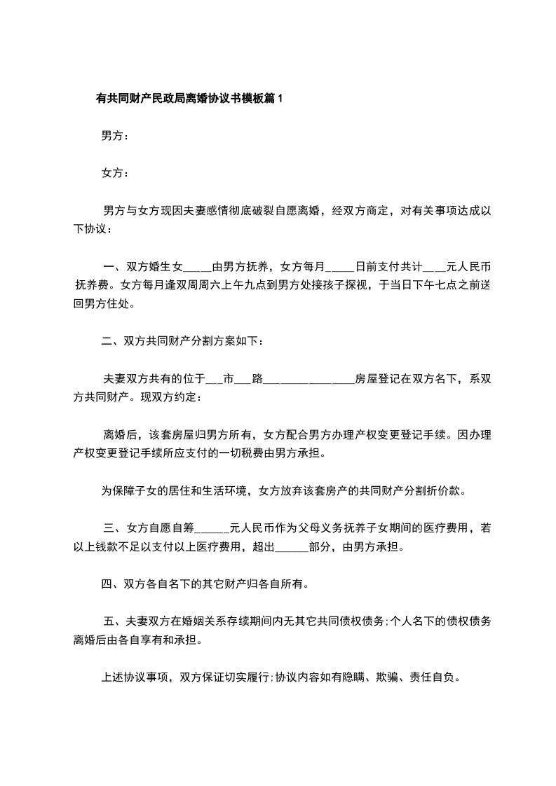 (1)夫妻婚后共有房屋坐落在______市______路______住房一套。现协商该套房产归______方所有,______方同意在办理完离婚手续后配合______方办理产权变更手续。
