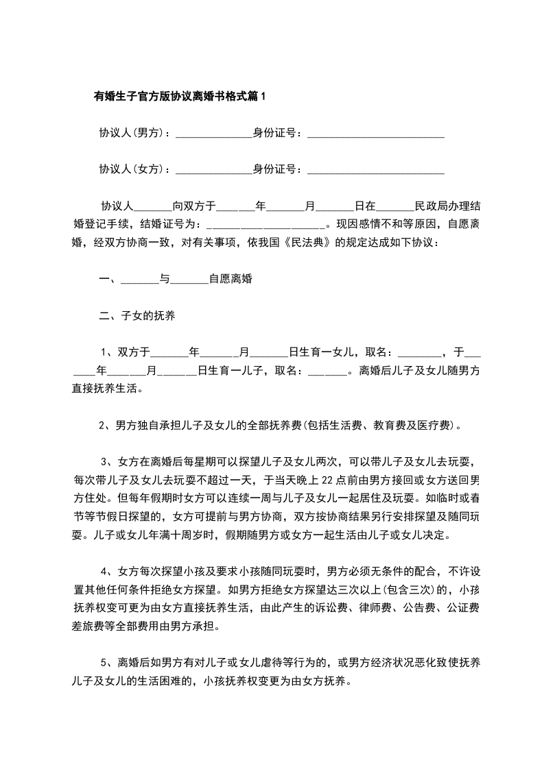 1、双方于_______年_______月_______日生育一女儿,取名:________,于_______年_______月_______日生育一儿子,取名:_______。离婚后儿子及女儿随男方直接抚养生活。