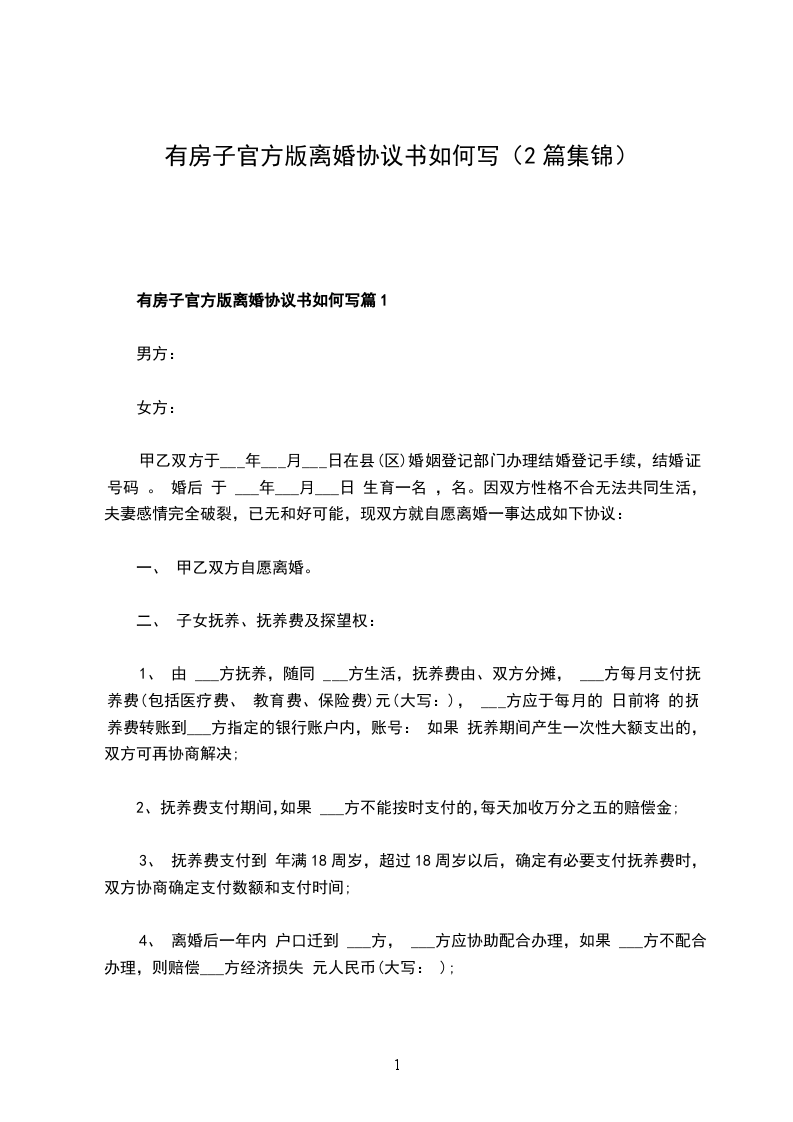 二、 双方共同财产分割方案:夫妻双方共有的位于___________市___________区(或县)___________号___________室房屋登记在_______方名下,系双方共同财产。现双方约定: