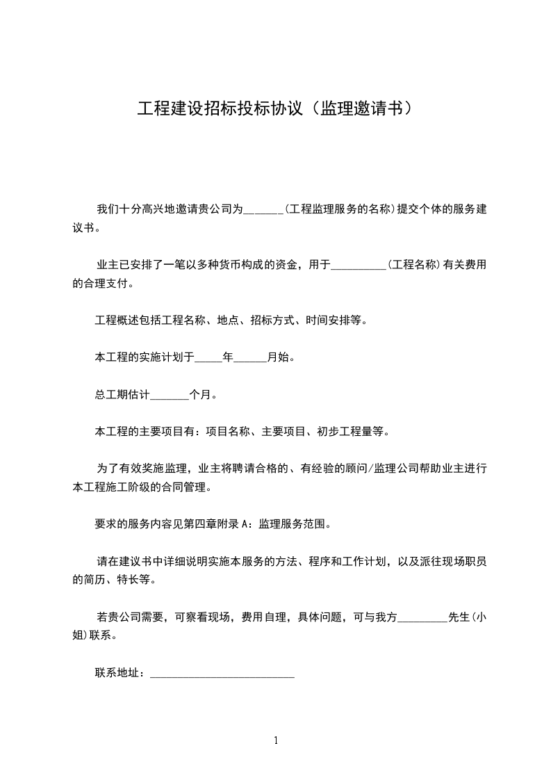 1. (业主名字)(下简称"业主")已安排了一笔以多种货币构成的资金,用于 (工程名称)建设费用的合理支付。所有如资格预审文件规定的来自合格货源并经资格预审合格了的投标人均可参加本工程的投标。