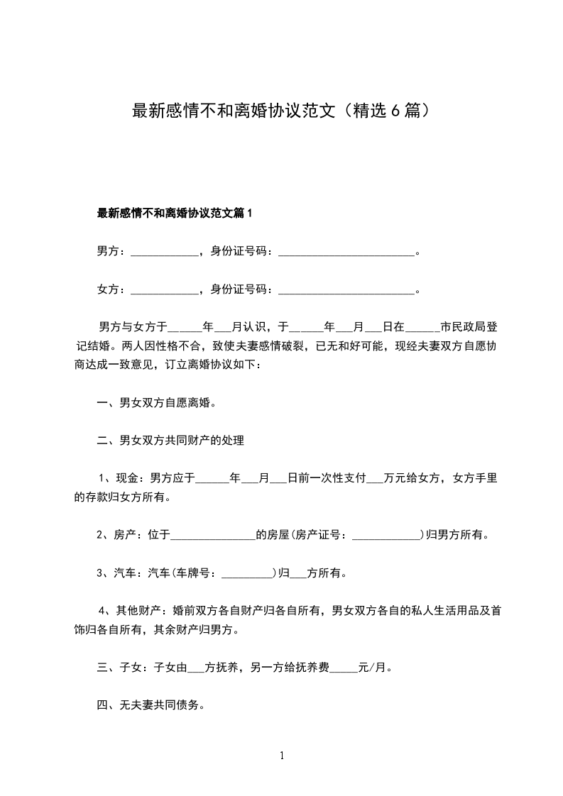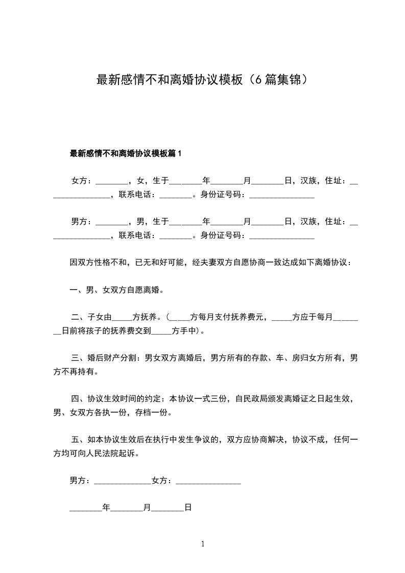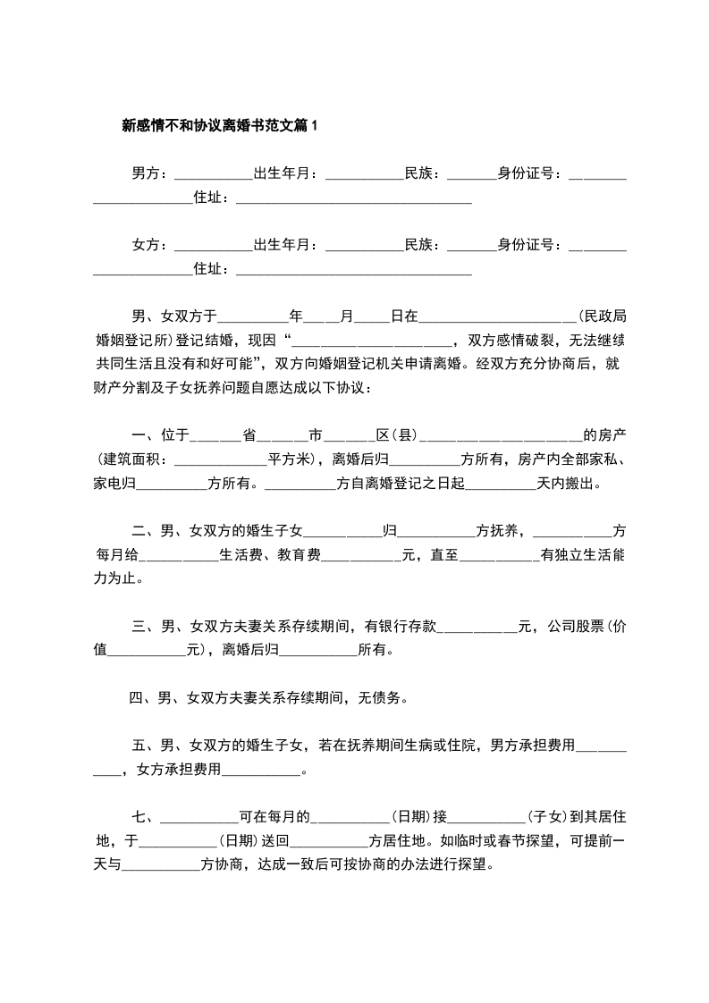 最新感情不和协议离婚范本格式篇1