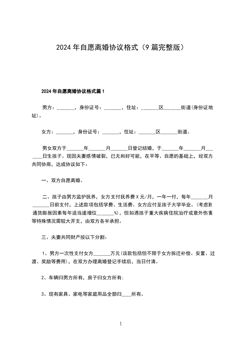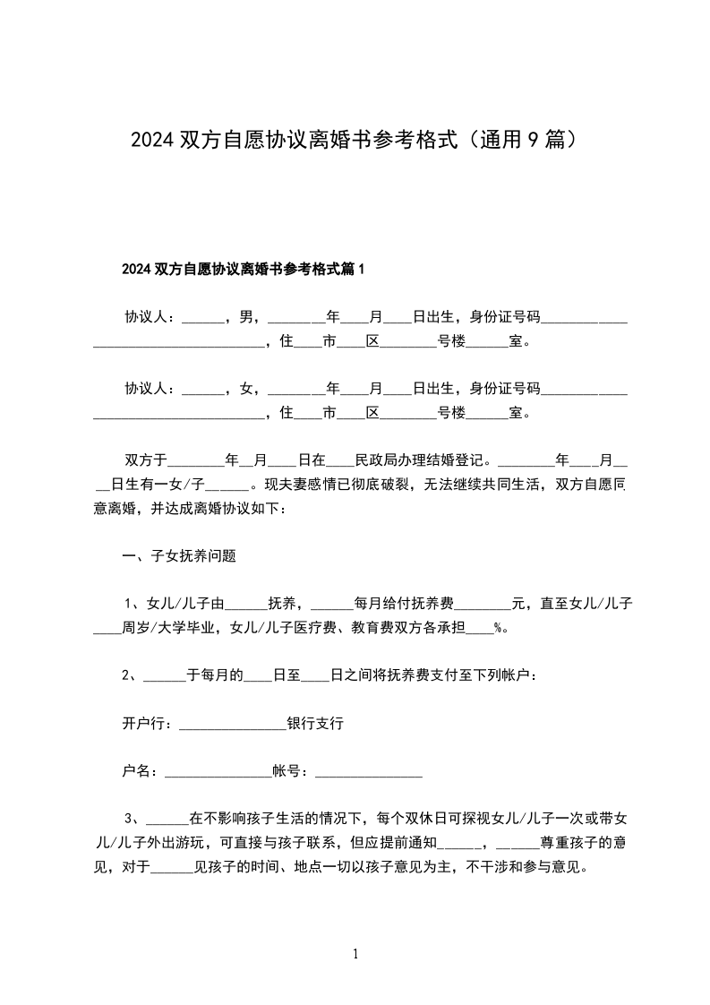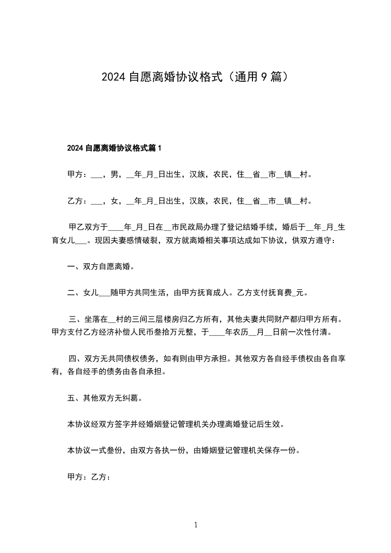 九、本协议一式________份,自婚姻登记处颁发离婚证之日起生效,男、女双方各执________份,婚姻登记机关存档一份。