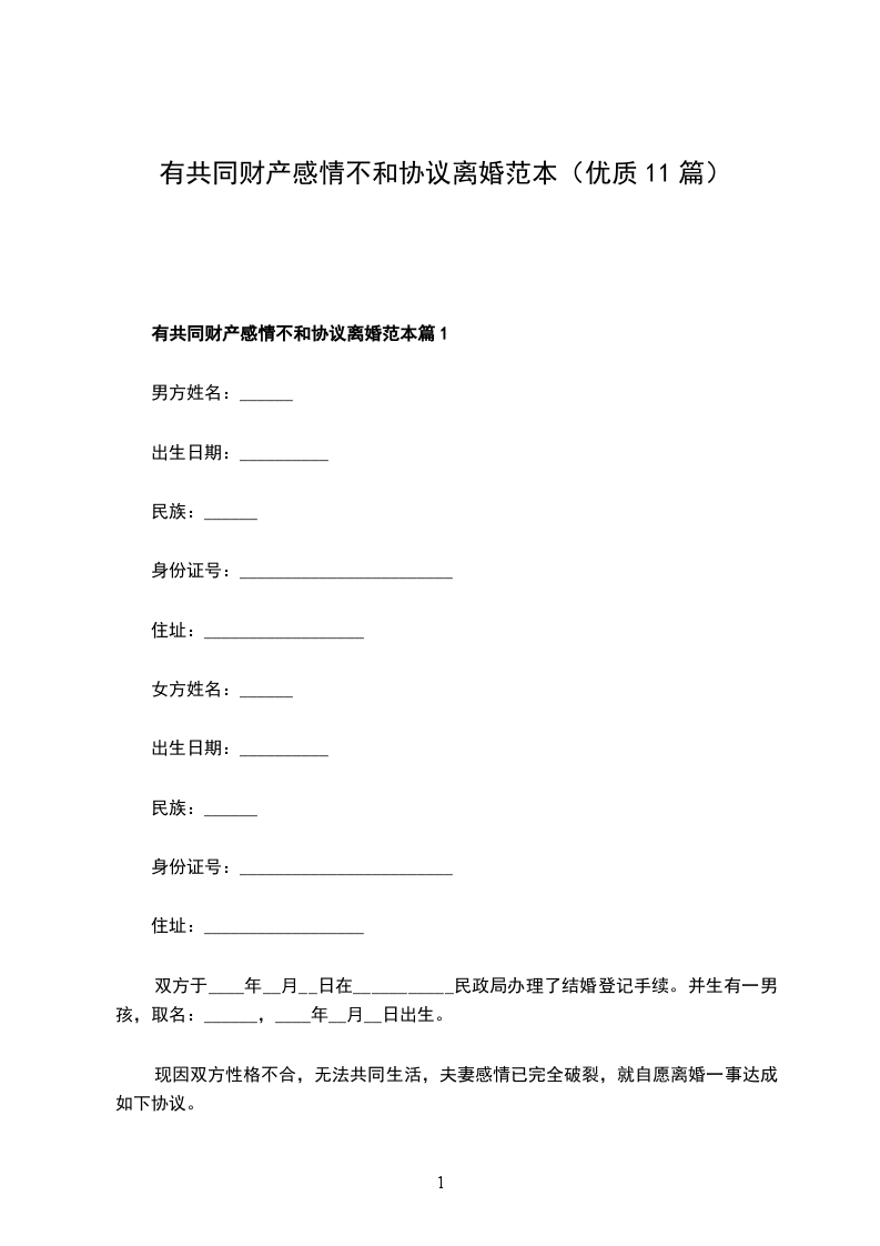 男方______与女方______于______年______月认识,于______年______月______日在______市民政局登记结婚,婚后于______年______月______日生育一儿子,名______。两人因性格不合,致使夫妻感情破裂,已无和好可能,现经夫妻双方自愿协商达成一致意见,订立离婚协议如下: