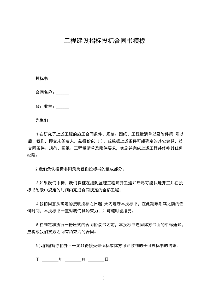 1在研究了上述工程的施工合同条件、规范、图纸、工程量清单以及附件第_号以后,我们,即文末签名人,兹报价以 ( ),或根据上述条件可能确定的其它金额,按合同条件、规范、图纸、工程量清单及附件要求,实施并完成上述工程并修补其任何缺陷。
