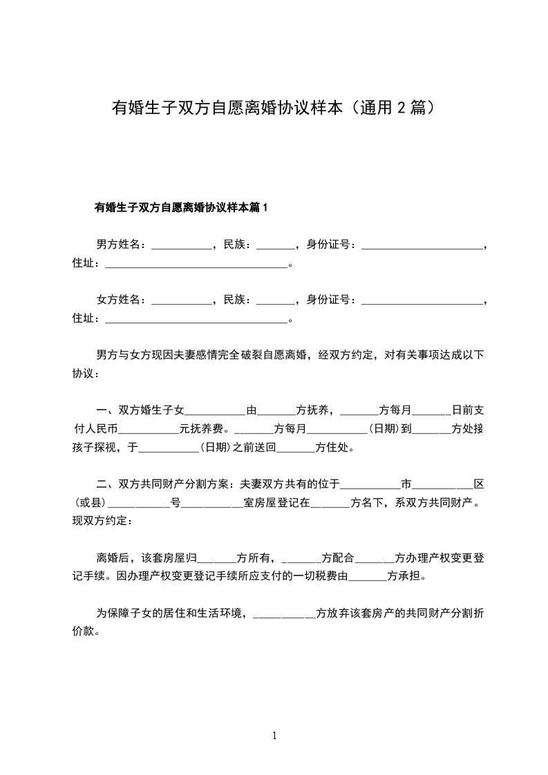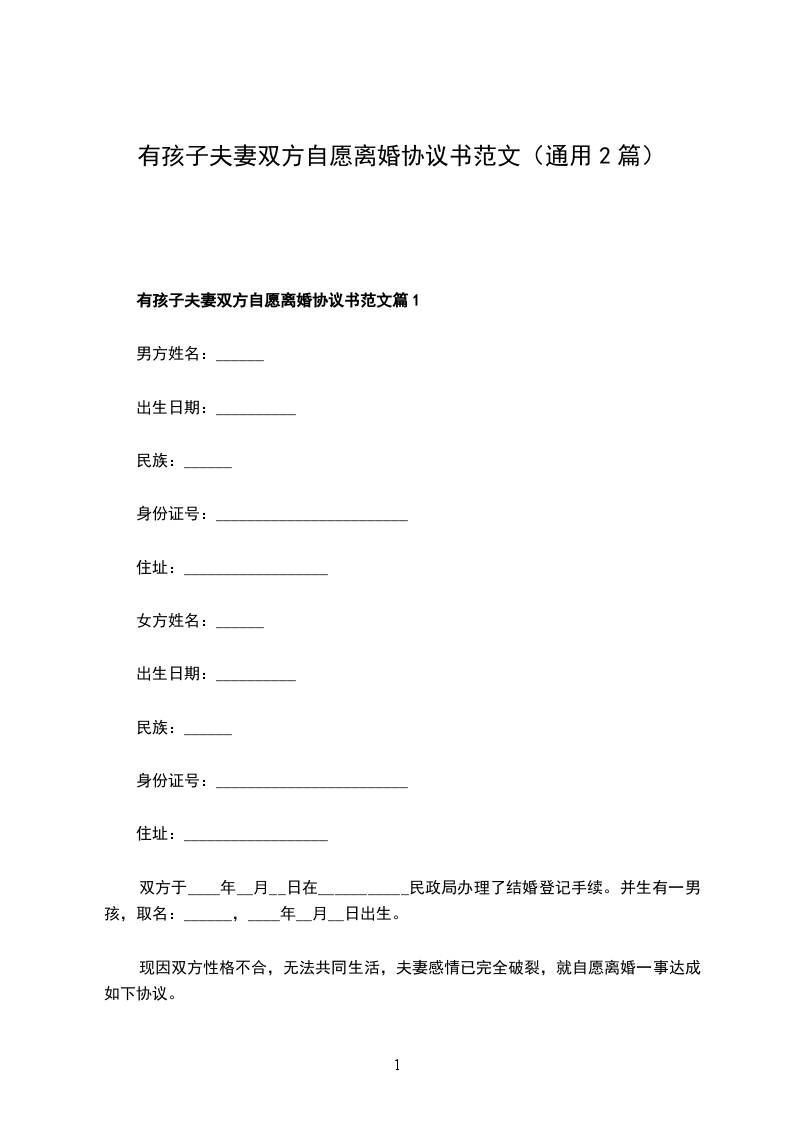 一、_______与_______自愿离婚