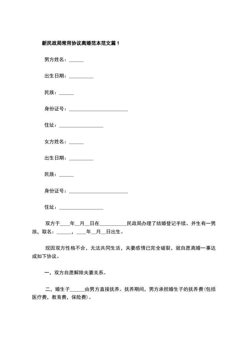 新民政局常用协议离婚范本范文篇8