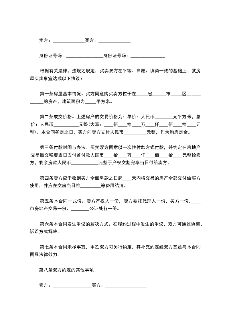 2、甲乙双方同意以一次性付款方式付款,并约定在房地产交易中心缴交税费当日支付首付款(含定金)人民币____拾____万____仟____佰____拾____元整给甲方,剩余房款人民币____________元整于产权交割完毕当日付给甲方。
