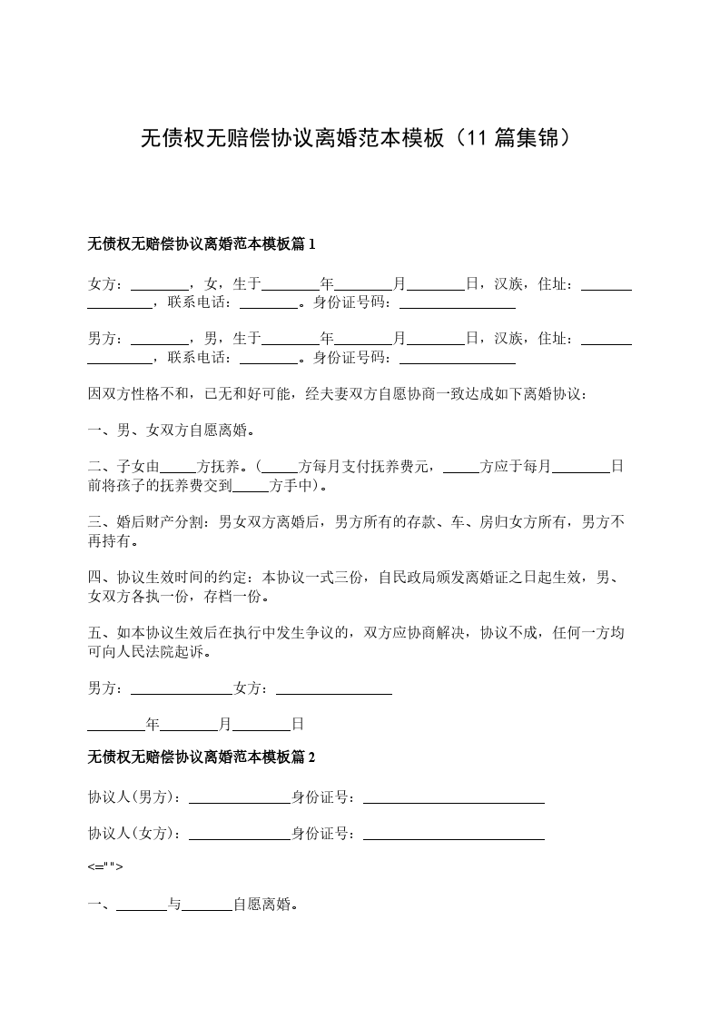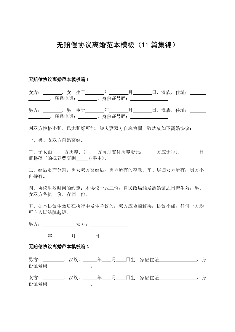 无赔偿协议离婚书参考样板篇11