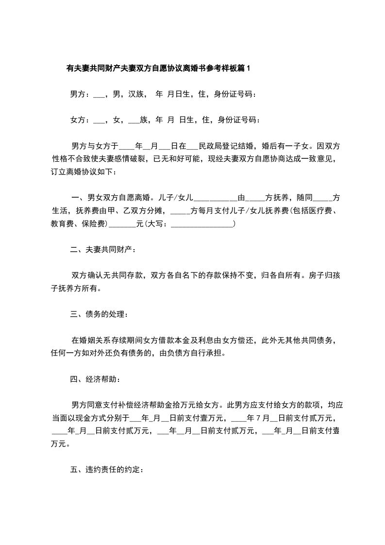 无共同的债务夫妻双方自愿离婚协议模板篇5
