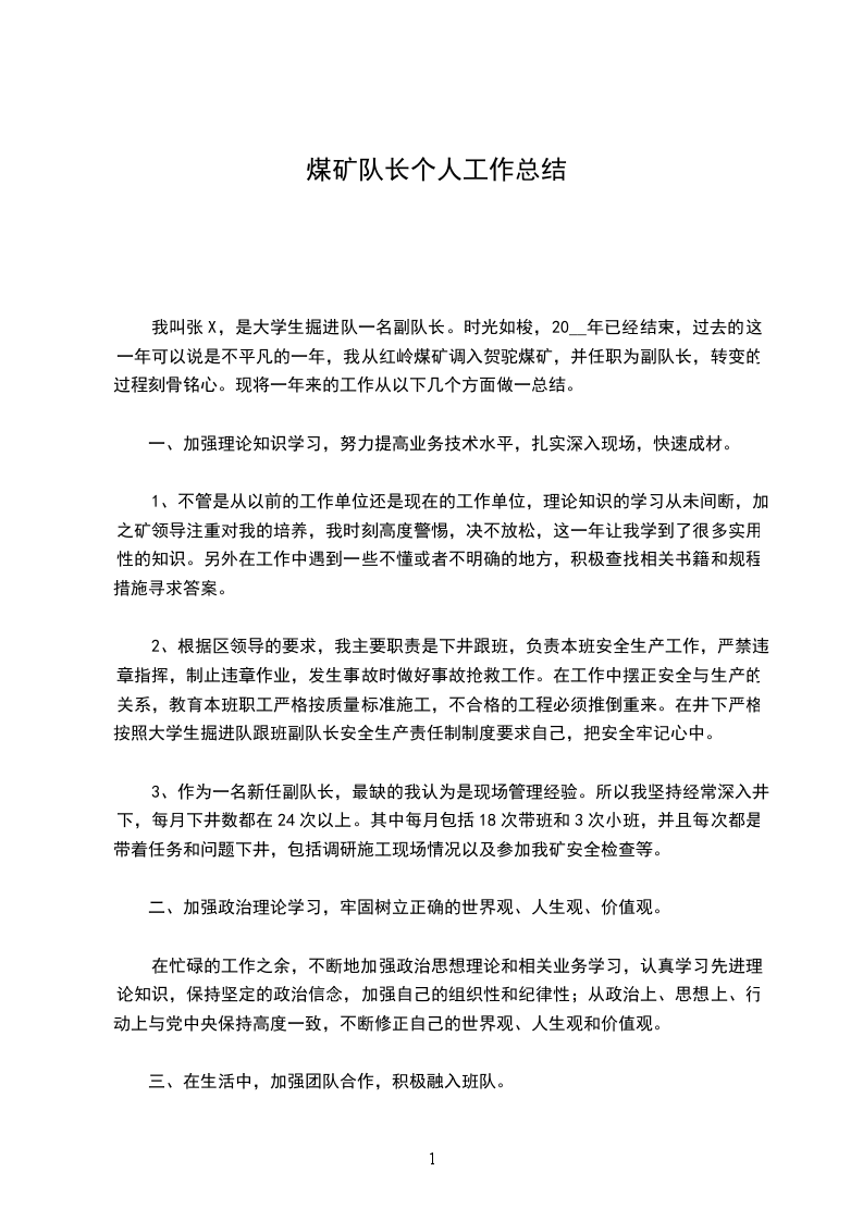 我叫张X,是大学生掘进队一名副队长。时光如梭,20__年已经结束,过去的这一年可以说是不平凡的一年,我从红岭煤矿调入贺驼煤矿,并任职为副队长,转变的过程刻骨铭心。现将一年来的工作从以下几个方面做一总结。