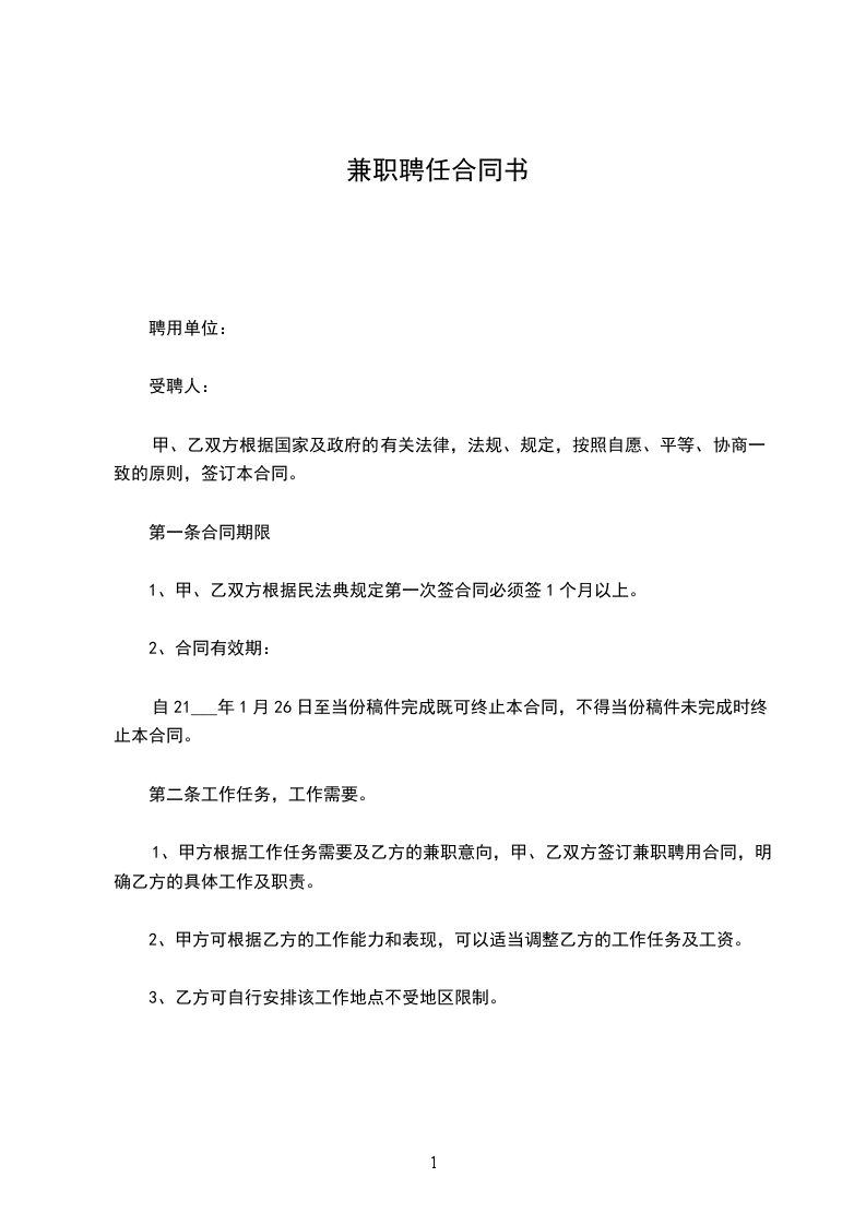 1、甲方根据工作任务需要及乙方的兼职意向,甲、乙双方签订兼职聘用合同,明确乙方的具体工作及职责。
