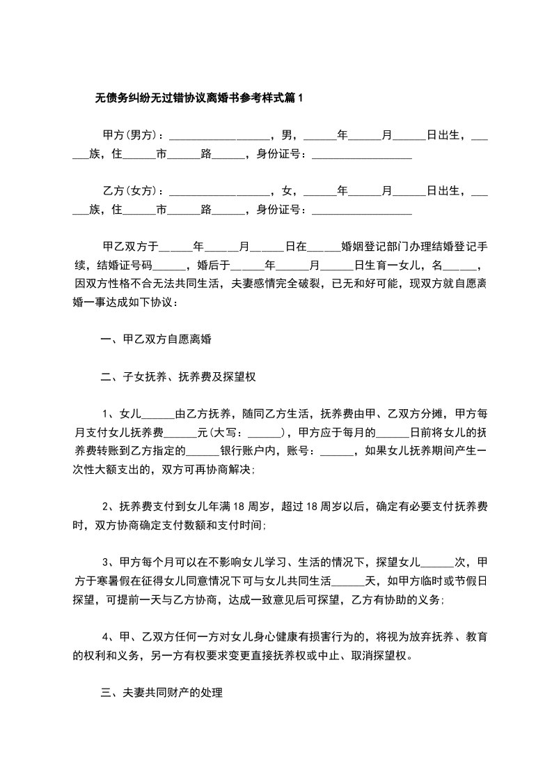 无债务纠纷无过错协议离婚书参考样式篇3
